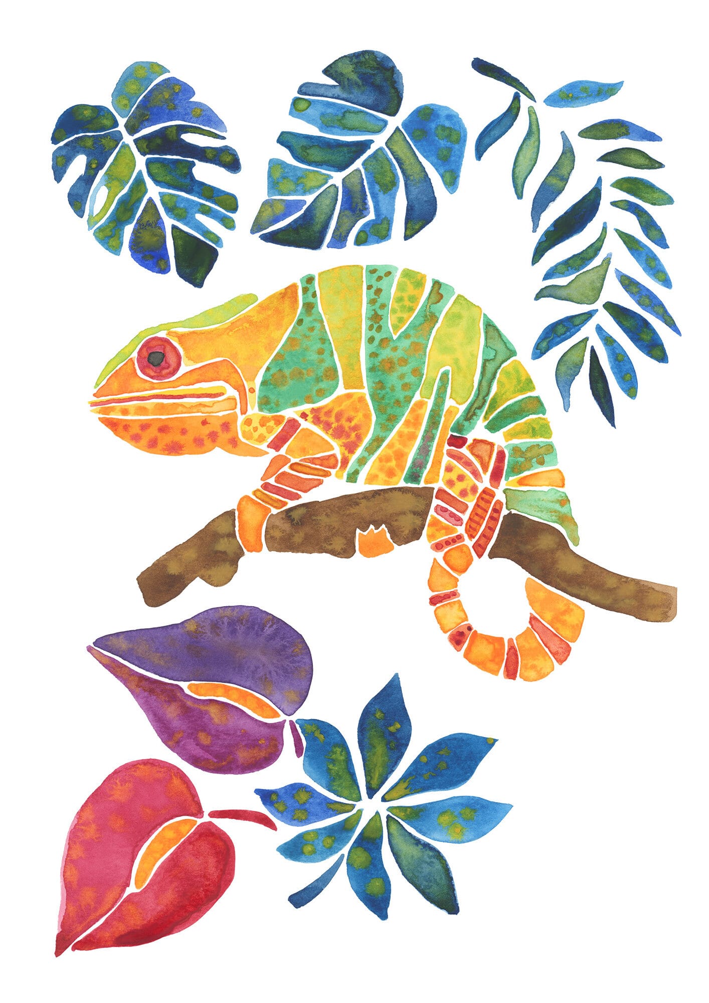 I create artwork with bright, vibrant colours, inspired by the natural world, botanicals and pop culture, working mainly with watercolours and digital hand drawn art.