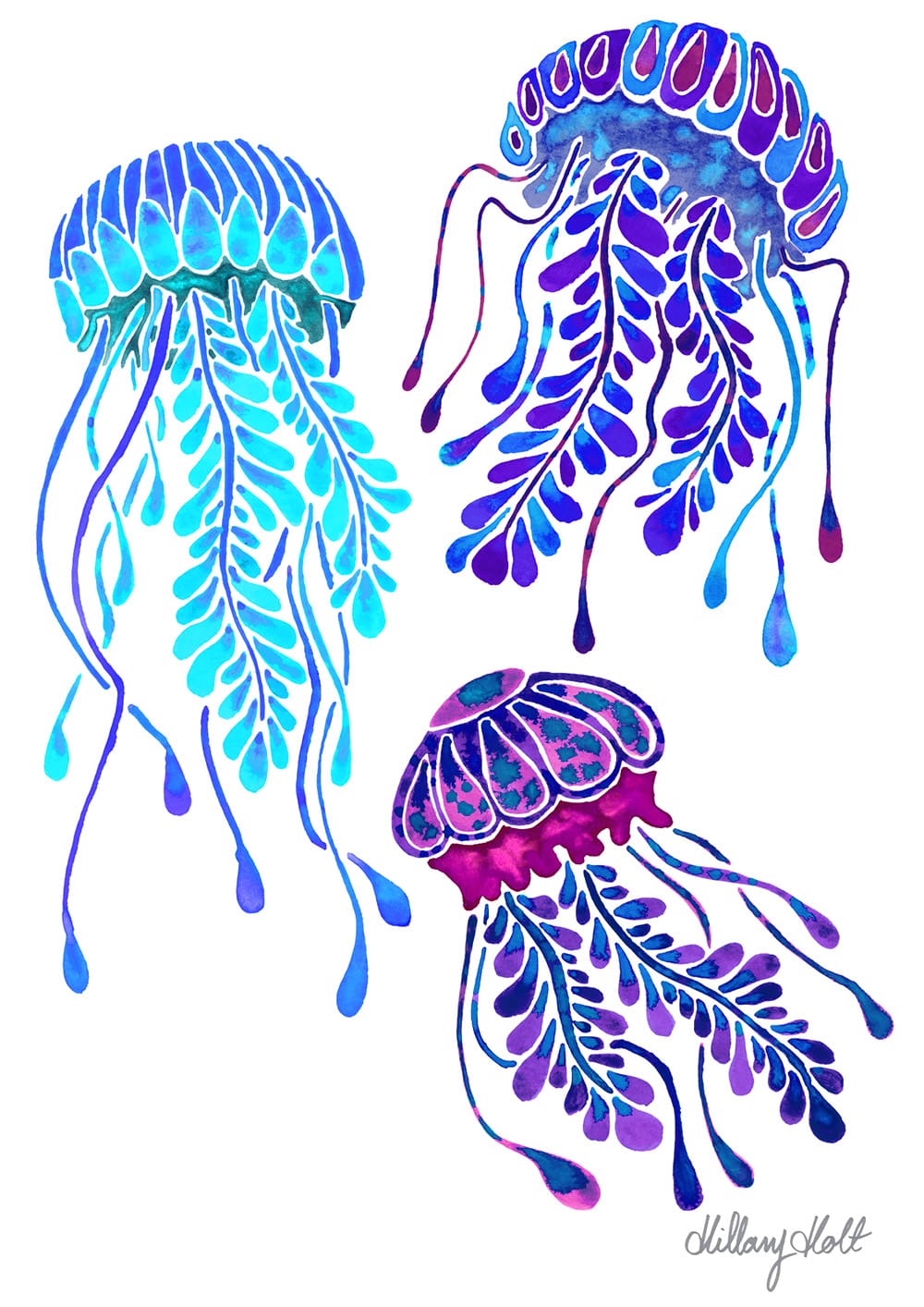 I love working with watercolours for their vibrant pigments and colour blooms, and the variety of techniques you can use in layers to create certain effects that complement each subject.