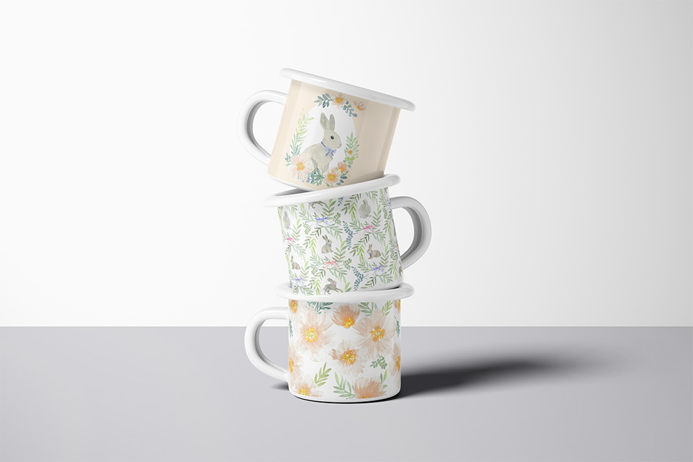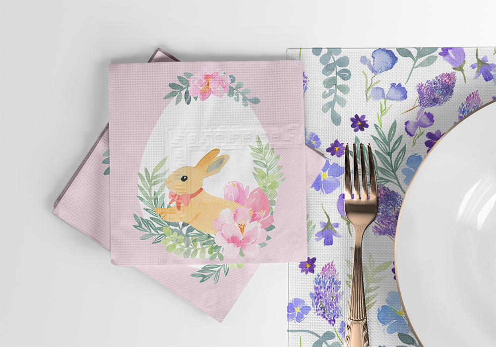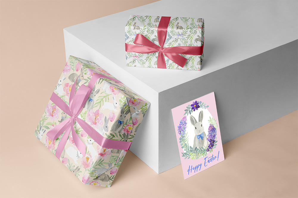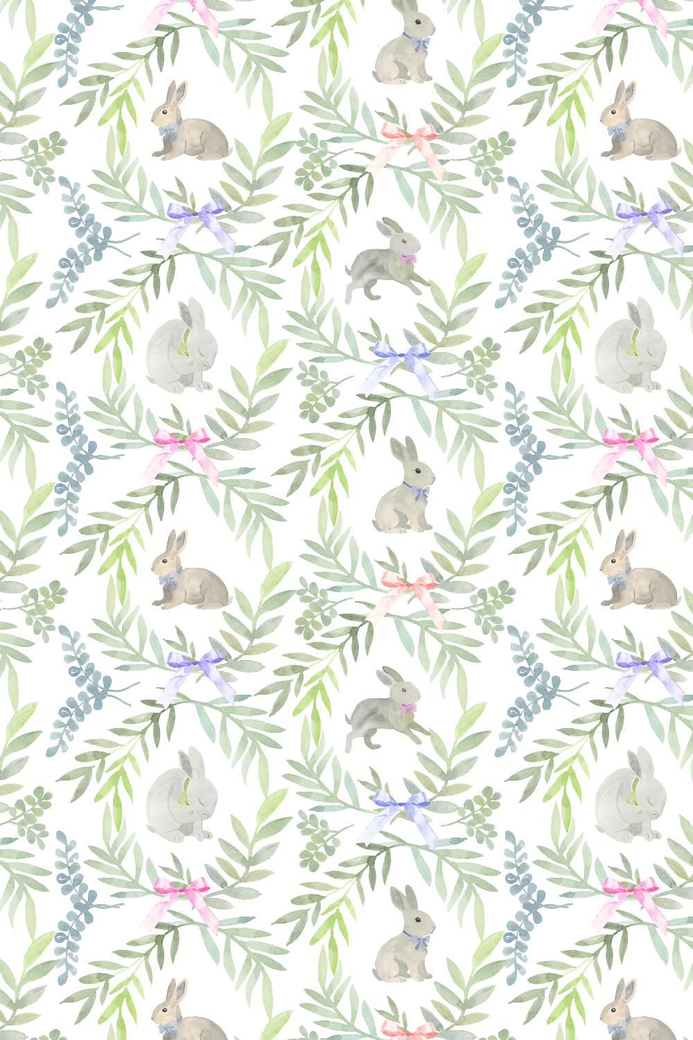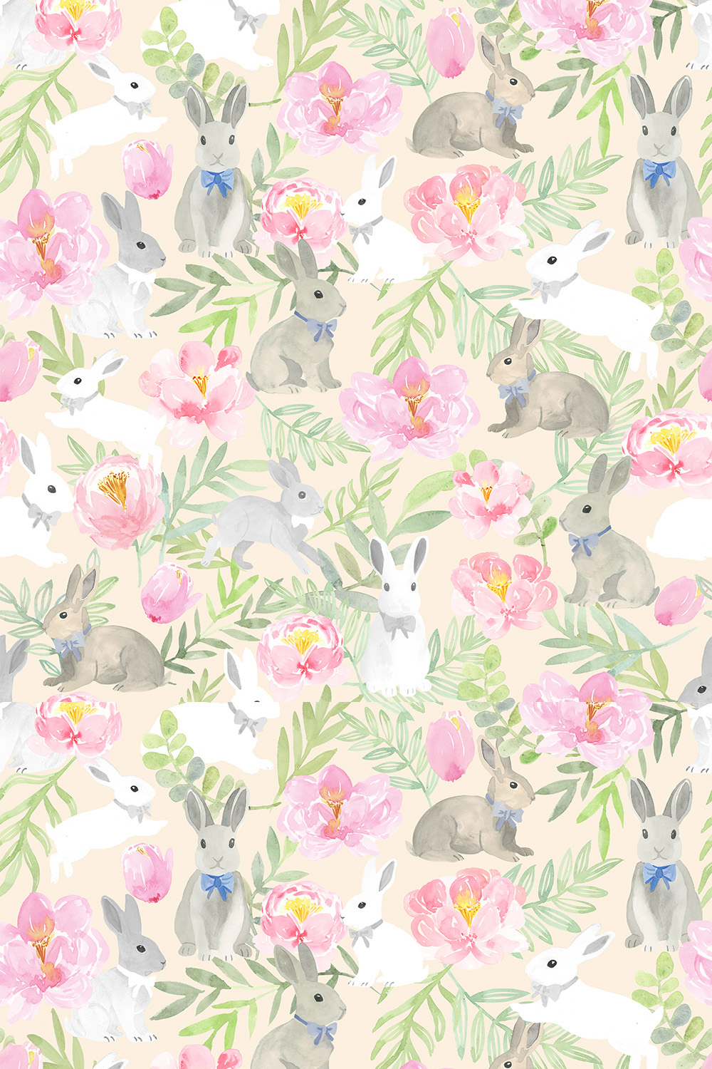 Nestled amongst the Spring Wildflowers, these cute rabbits don their bows and await their Easter festivities. Pink Peonies, golden poppies and purple lilac compliment the soft pastel tones, perfect for an easter themed or spring collection of stationery, gift wrap or gift products