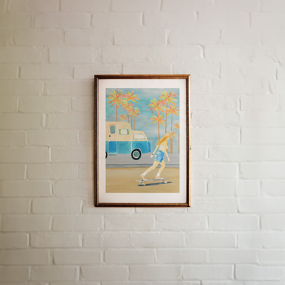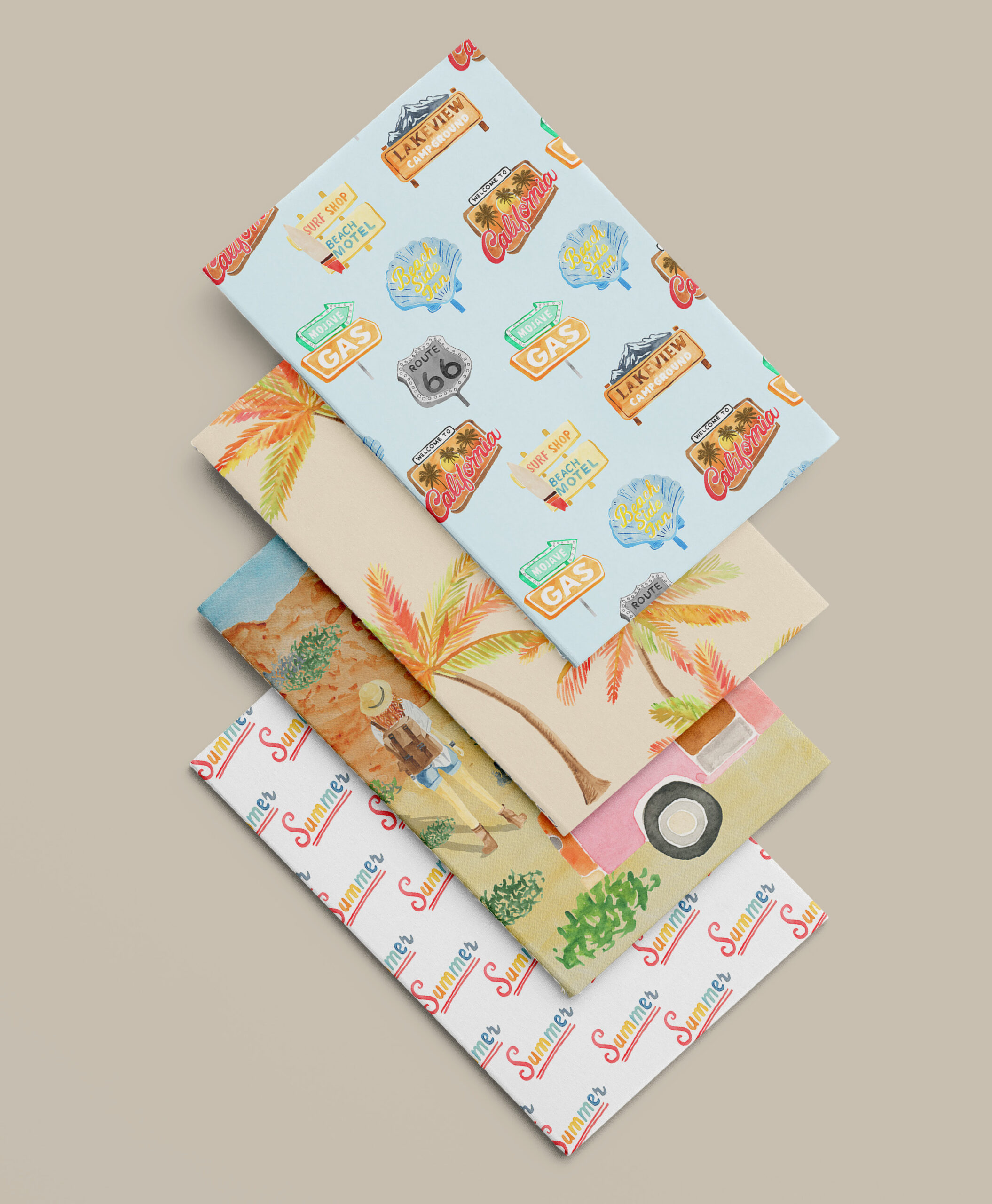 Late Summer, hot sun, the summer is fading so let's make the most of an epic summer road trip! Exploring the beauty and breadth of the Californian landscape on the best outdoor adventure. Pack the campervan and the surfboards, we're going hiking in the desert, paddle boarding on Lake Taho, skateboarding down Hollywood Boulevard and watching the sun rise over Santa Monica Beach. A collection full of late summer warm retro colors brings a sense of nostalgia and high adventure to this collection with 7 patterns for versatility across stationery, wall art and gifting products.
