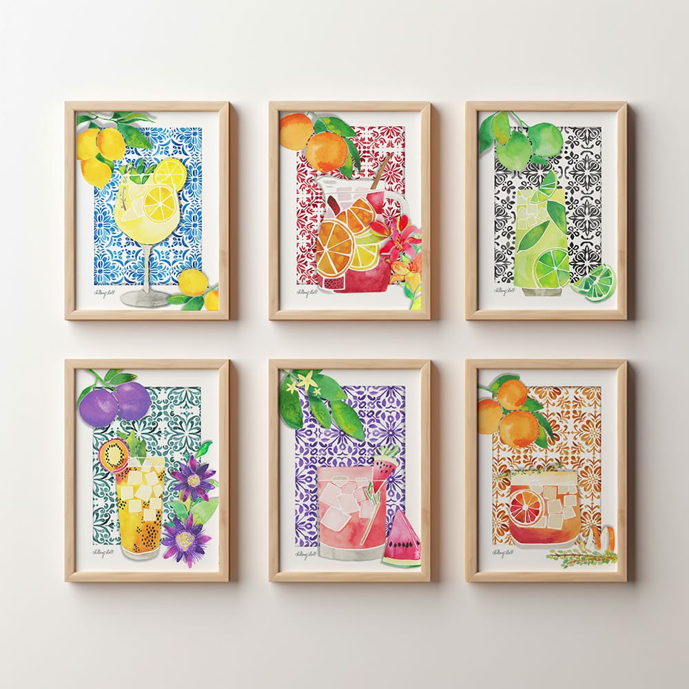 Immerse in the vibrant essence of Mediterranean culture with stunning illustrations and surface designs inspired by refreshing cocktails. Featuring lively colors and intricate patterns, this collection showcases mojitos, sangrias, and limoncellos. Perfect for home decor, stationery, and unique gifts, these artworks bring a cheerful Mediterranean spirit to any space.