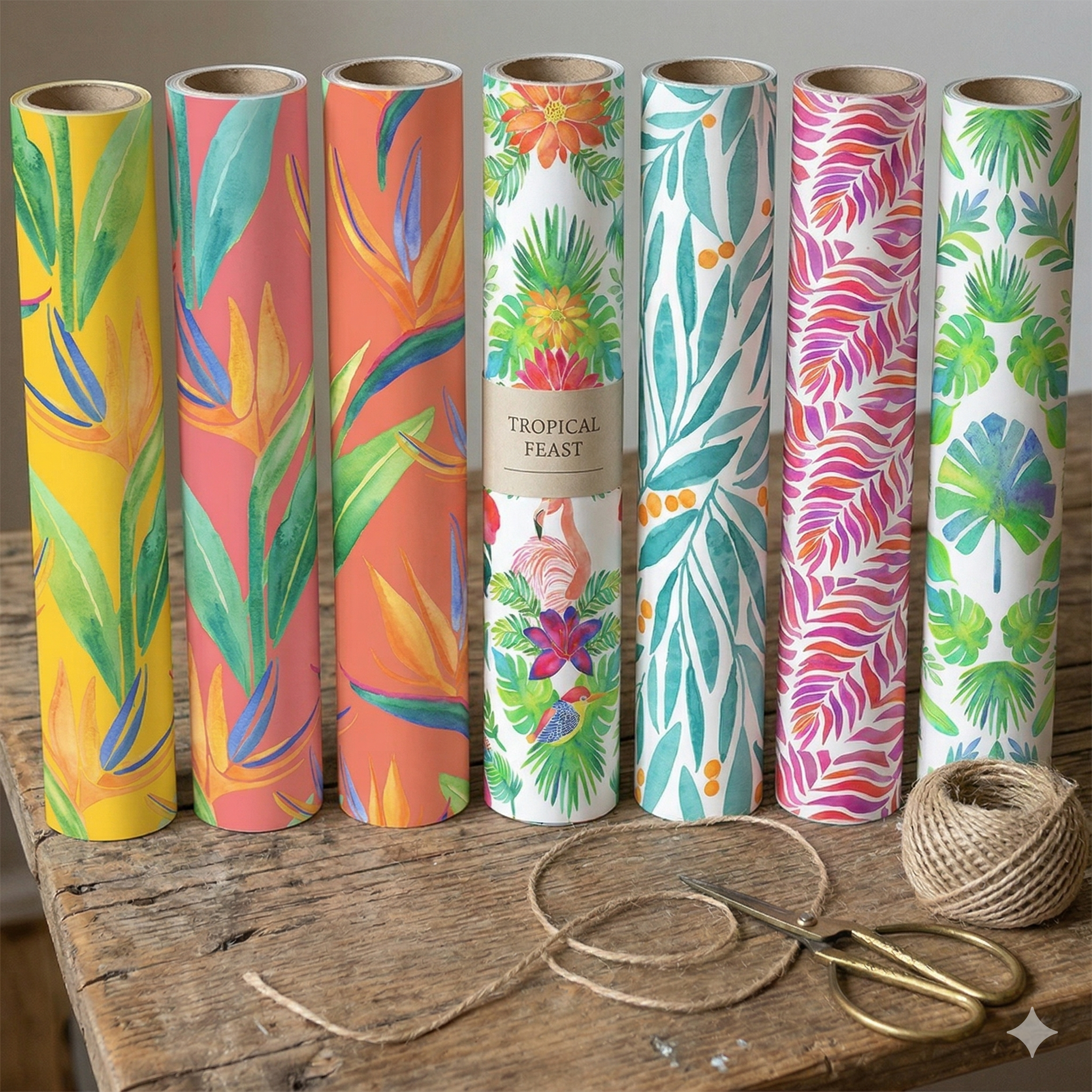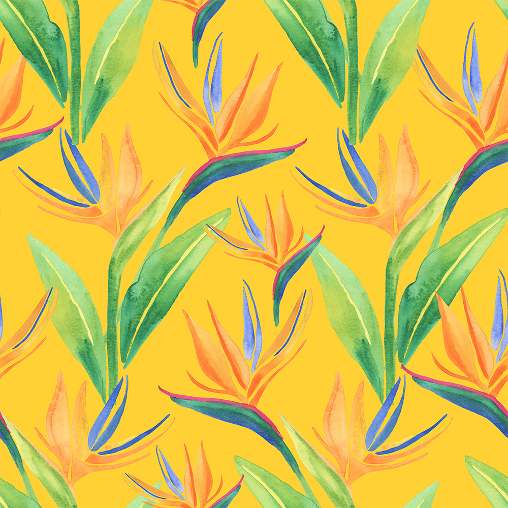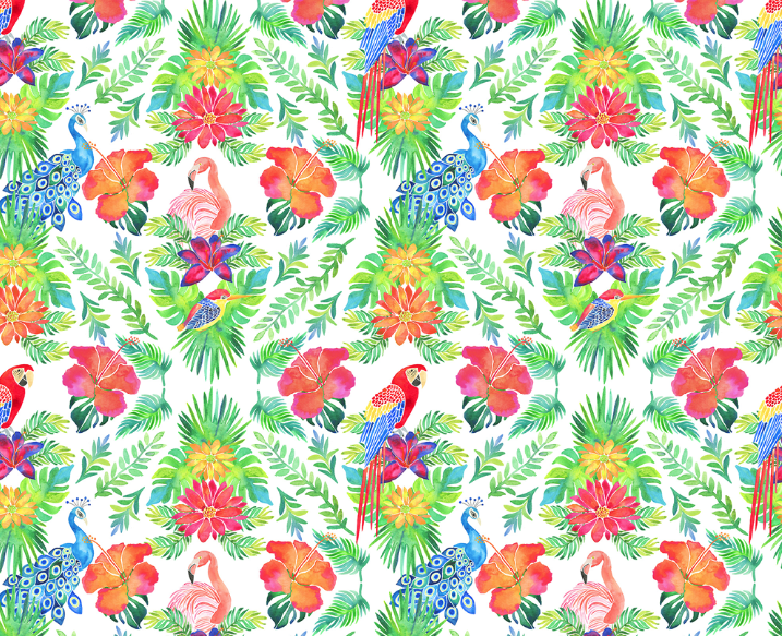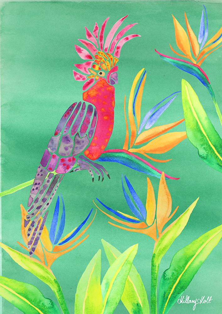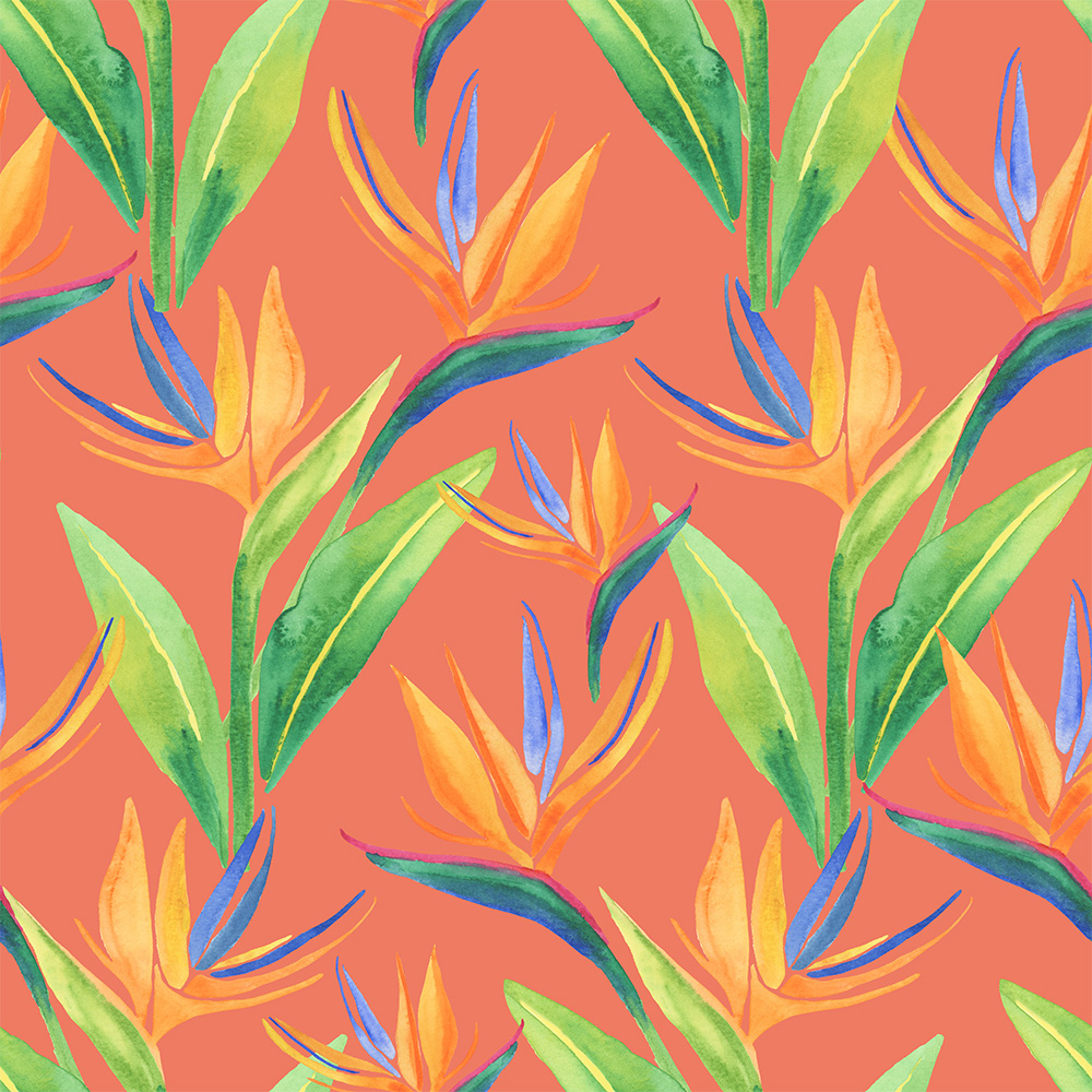 Colourful tropical birds of paradise including a pink flamingo, red and blue macaw, royal peacock, toucan, kingfisher, and pink galah rest of Birds of Paradise blooms in the tropics. Paired with colourful florals and foliage make the perfect combination for gift wrap, stationery and wall art.