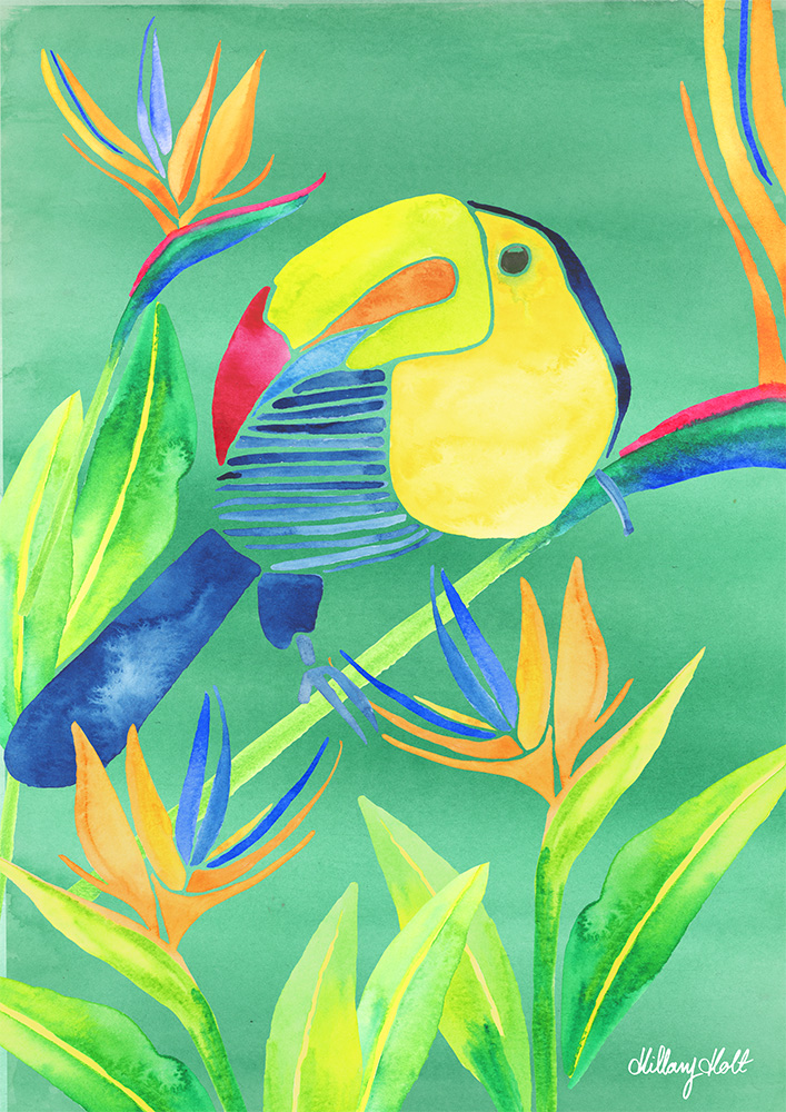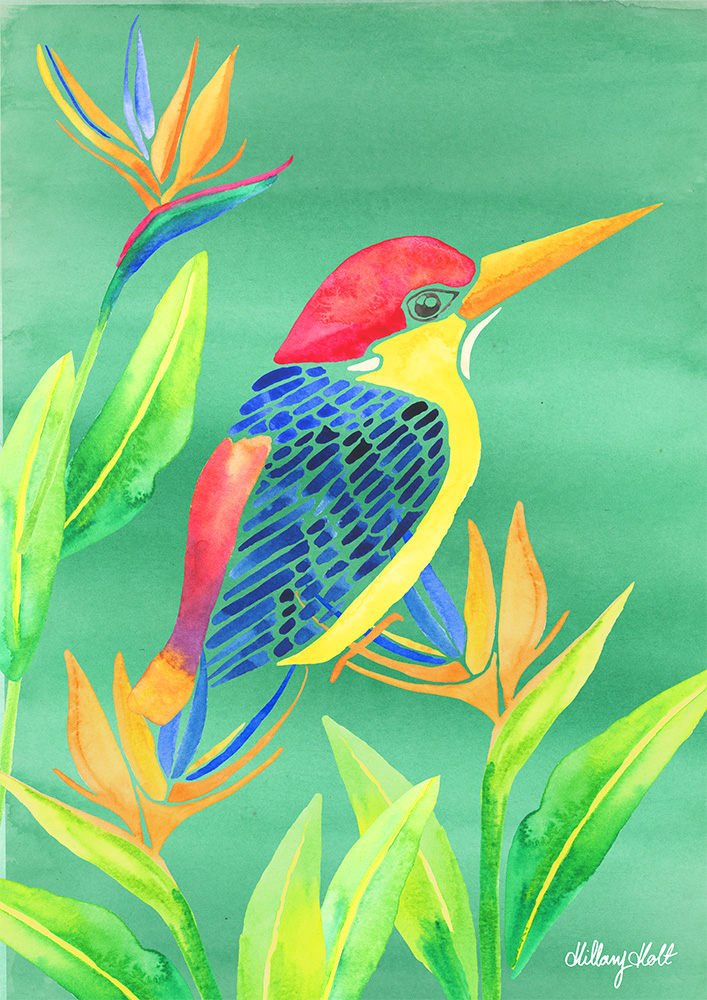 I create artwork with bright, vibrant colours, inspired by the natural world, botanicals and pop culture, working mainly with watercolours and digital hand drawn art.